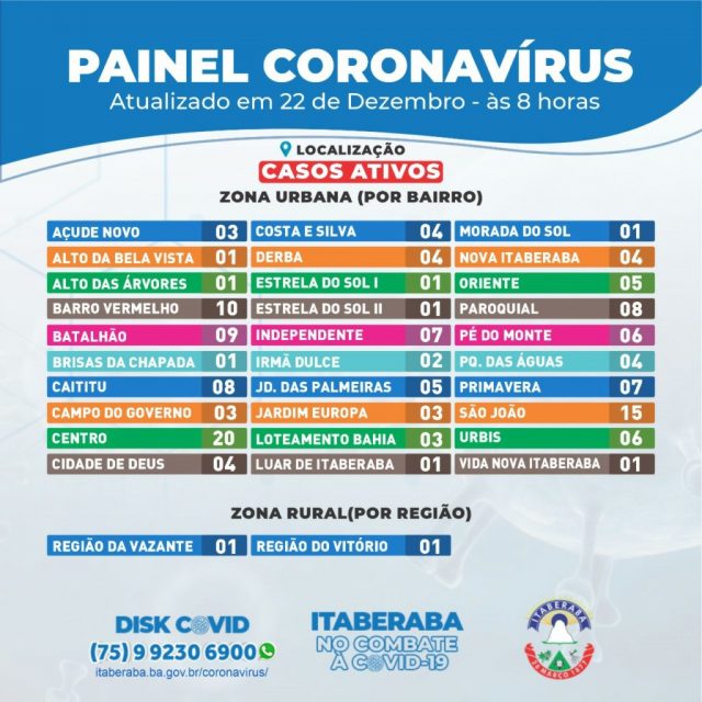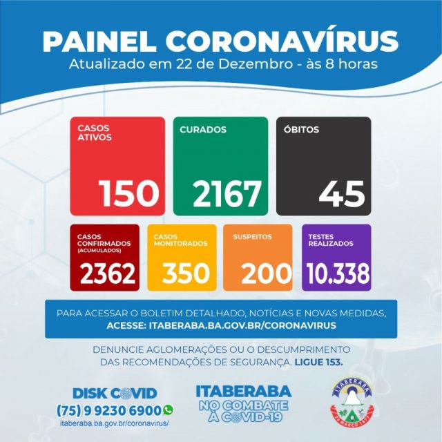 A Prefeitura de Itaberaba, por meio da Secretaria Municipal de Saúde (Sesau), assim como da Coordenação de Vigilância em Saúde e da Câmara Técnica (CT) de enfrentamento da pandemia do novo coronavírus, informa o Boletim Oficial 22/12 ㅡ com dados consolidados até às 17h de segunda-feira (21) ㅡ que registrou 4 novos casos da COVID-19.