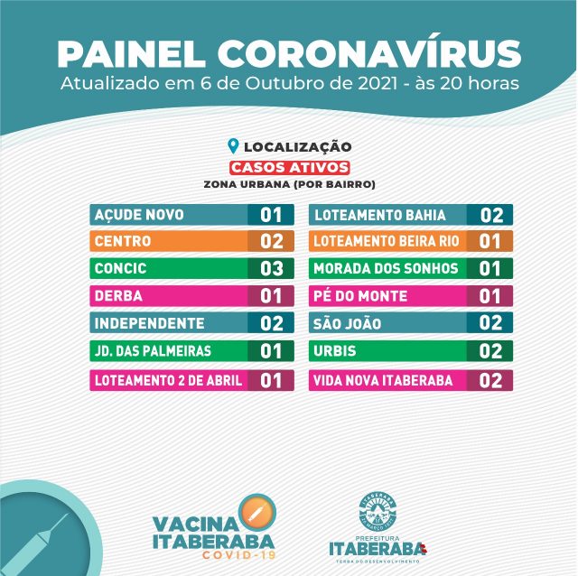 A Prefeitura de Itaberaba, por meio da Secretaria Municipal da Saúde, informa o boletim diário de quarta-feira (06) com dados consolidados até as 17h.