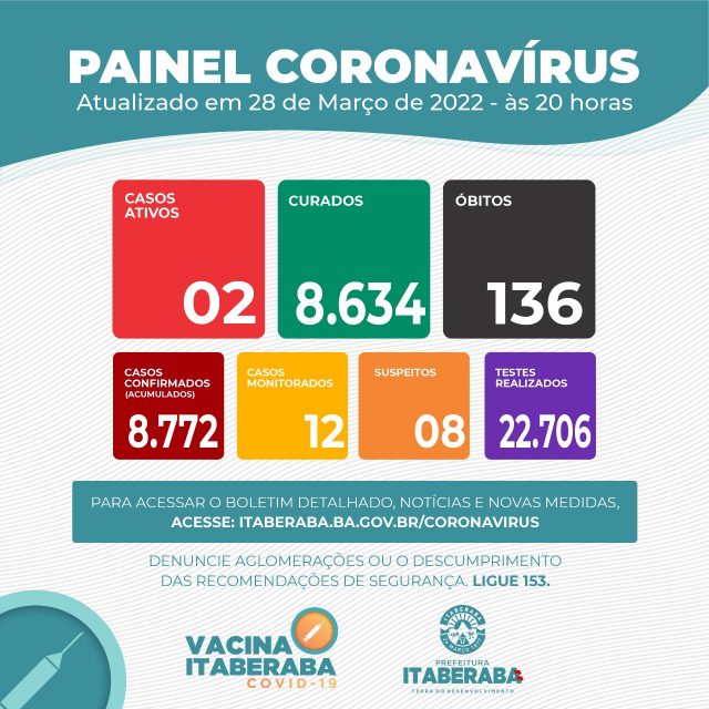 De acordo com o boletim, atualmente Itaberaba tem 02 casos ativos da doença, 08 casos suspeitos e 12 casos monitorados.