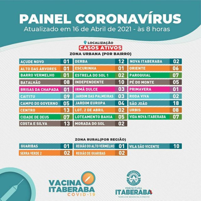 Desde o início da pandemia, 78 pessoas perderam a vida por conta da pandemia de coronavírus em Itaberaba. O ultimo óbito foi registrado no Boletim Informativo desta sexta-feira (16), divulgado pela prefeitura municipal.