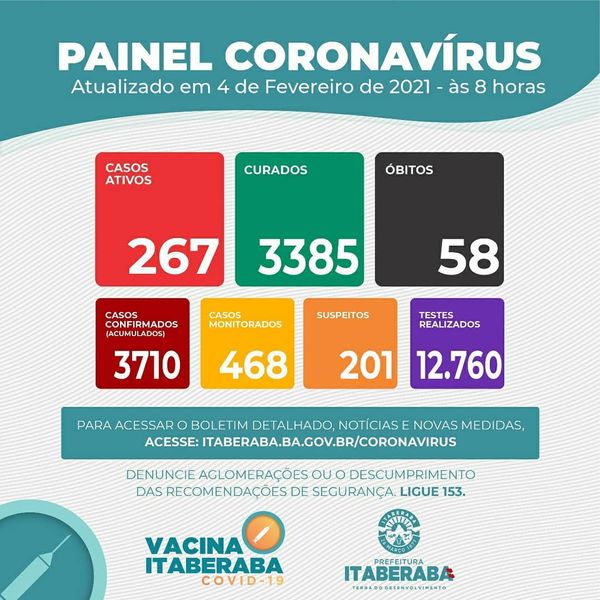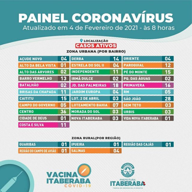 Itaberaba registrou mais uma morte por coronavírus e 22 novos casos da doença. A informação foi confirmada pela prefeitura, no boletim epidemiológico dos casos de coronavírus, na manhã desta quinta-feira (04).