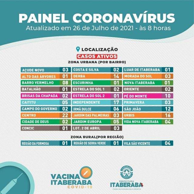 A Prefeitura de Itaberaba, por meio da Secretaria Municipal da Saúde, informa o boletim diário de segunda-feira (26) com dados consolidados até as 17h de sexta-feira (23).