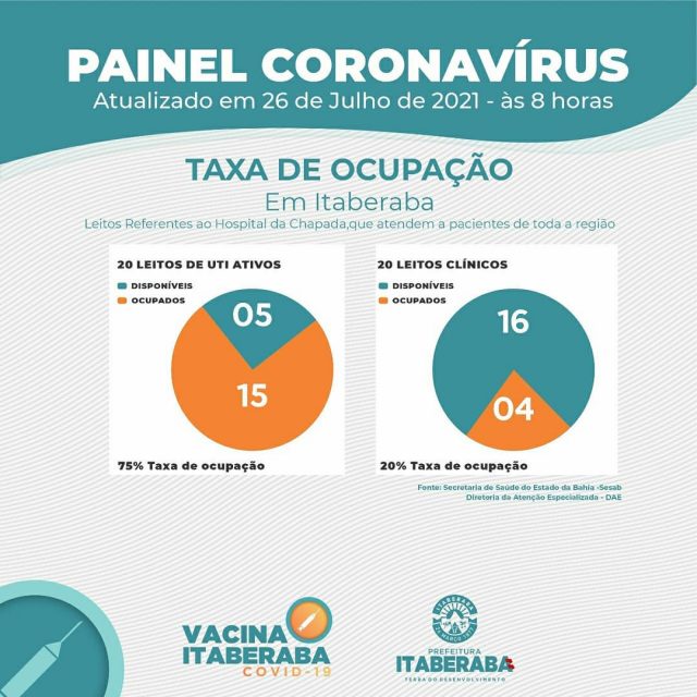 De acordo com o boletim diário de segunda-feira (26) e do Estado da Bahia – SESAB, atualmente os números da taxa de ocupação de leitos no município são: 20 Leitos Clínicos, com 4 leitos ocupados, representando 20% de taxa de ocupação; 20 Leitos de Unidades de Terapia Intensiva – UTI, com 15 leitos ocupados, representando 75% de taxa de ocupação.