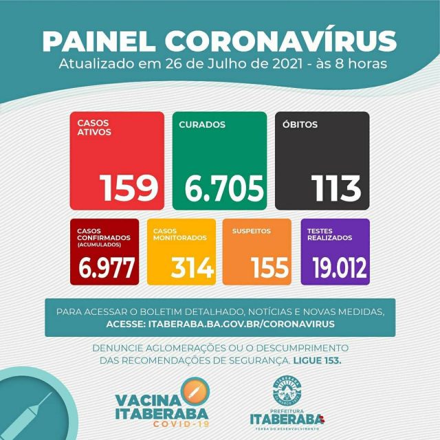 Atualmente Itaberaba tem 159 casos ativos, 155 casos suspeitos, 314 casos monitorados e 113 óbitos registrados pela doença. O número de casos curados é de 6.705 e, ao todo, já foram confirmados 6.977 casos da COVID-19 no município. Além disso, já foram realizados o total de 19.012 exames, dentre Testes Rápidos e RT-PCR/SWAB.