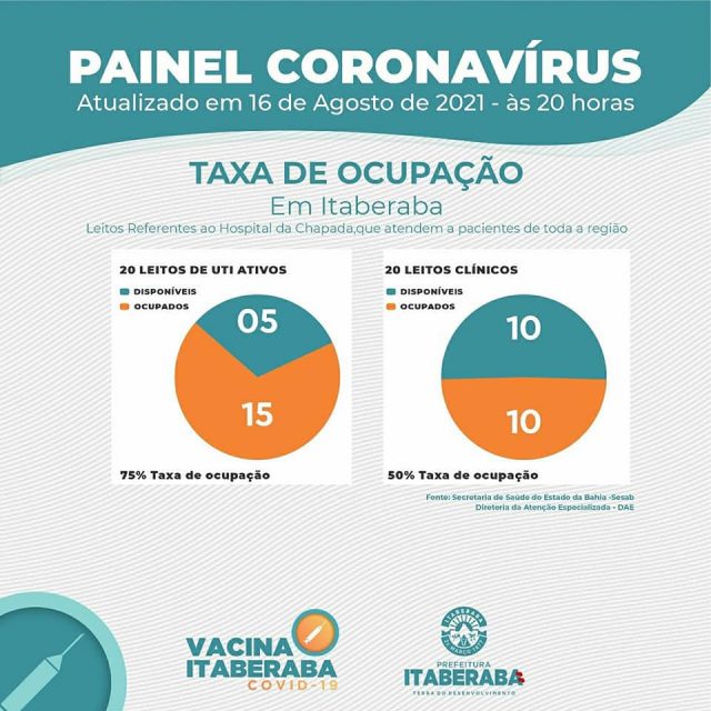 De acordo com o boletim diário de segunda-feira (16) e do Estado da Bahia – SESAB, atualmente os números da taxa de ocupação de leitos no município são: 20 Leitos Clínicos, com 10 leitos ocupados, representando 50% de taxa de ocupação; 20 Leitos de Unidades de Terapia Intensiva – UTI, com 15 leitos ocupados, representando 75% de taxa de ocupação.