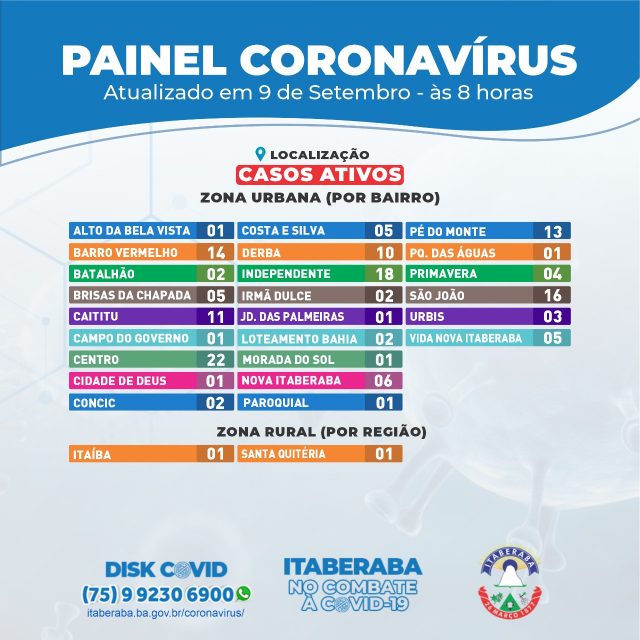A Prefeitura de Itaberaba, por meio da Secretaria Municipal de Saúde (Sesau), assim como da Coordenação de Vigilância em Saúde e da Câmara Técnica (CT) de enfrentamento da pandemia do novo coronavírus, informa o Boletim Oficial 09/09 ㅡ com dados consolidados até às 17h de terça-feira (8) ㅡ que registrou 19 novos casos da COVID-19.