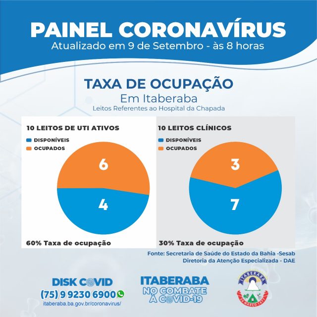 De acordo com o Boletim Oficial 09/09, até às 17h de terça-feira (8), os números da Taxa de Ocupação Leitos Clínicos e de Unidades de Terapia Intensiva (UTI) no município, com dados da Secretaria da Saúde do Estado da Bahia (Sesab), são os seguintes: dos 10 LEITOS DE UTI ATIVOS, 6 estão ocupados (60%); ao passo que, dos 10 LEITOS CLÍNICOS, 3 estão ocupados atualmente (30%). A taxa de ocupação geral é de 45%.