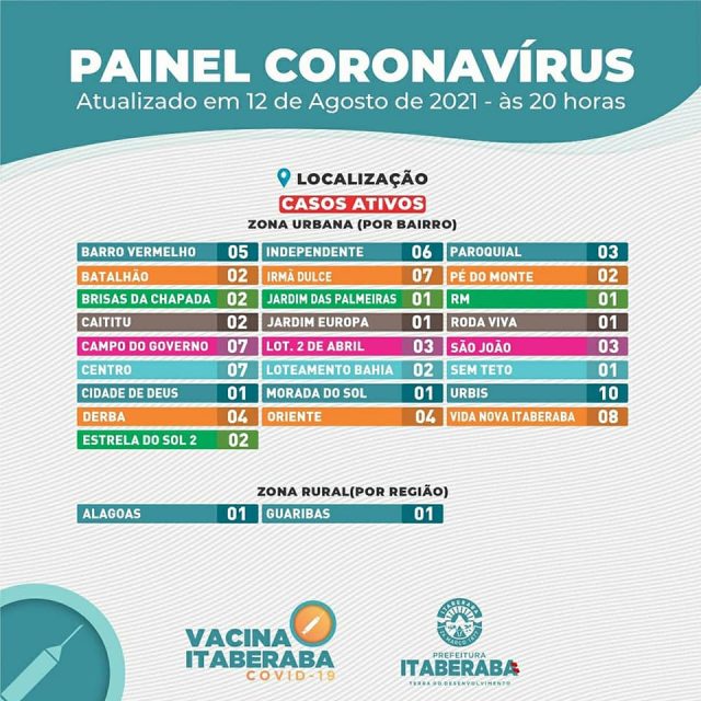 A Prefeitura de Itaberaba, por meio da Secretaria Municipal da Saúde, informa o boletim diário de quinta-feira (12) com dados consolidados até as 17h.