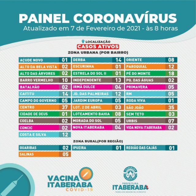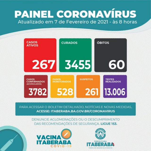 A Prefeitura de Itaberaba, por meio da Secretaria Municipal de Saúde (Sesau), assim como da Coordenação de Vigilância em Saúde e da Câmara Técnica (CT) de enfrentamento da pandemia do novo coronavírus, informa o Boletim Oficial 07/02 ㅡ com dados consolidados até às 17h de sábado (06) ㅡ que registrou 21 novos casos da COVID-19.