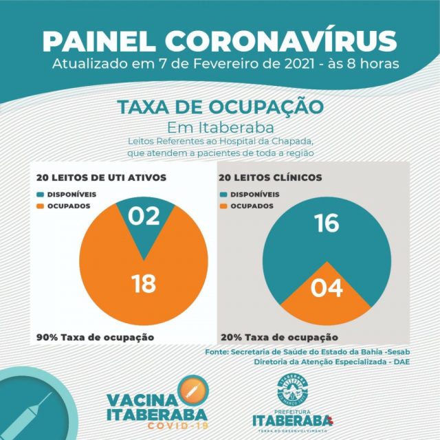 De acordo com o Boletim Oficial 07/02, até às 17h de sábado (06), os números da Taxa de Ocupação de Leitos Clínicos e de Unidades de Terapia Intensiva (UTIs) no município, com dados da Secretaria da Saúde do Estado da Bahia (Sesab), são os seguintes: dos 20 LEITOS DE UTI ATIVOS, 18 estão ocupados; ao passo que, dos 20 LEITOS CLÍNICOS, 04 estão ocupados atualmente.