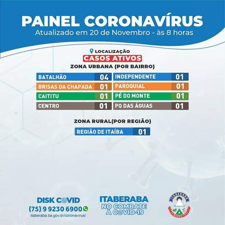 A Prefeitura de Itaberaba, por meio da Secretaria Municipal de Saúde (Sesau), assim como da Coordenação de Vigilância em Saúde e da Câmara Técnica (CT) de enfrentamento da pandemia do novo coronavírus, informa o Boletim Oficial 20/11 ㅡ com dados consolidados até às 17h de quinta-feira (19) ㅡ que registrou 3 novos casos da COVID-19.
