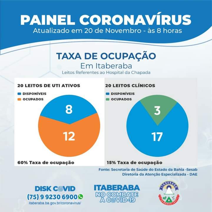 De acordo com o Boletim Oficial 20/11, até às 17h de quinta-feira (19), os números da Taxa de Ocupação de Leitos Clínicos e de Unidades de Terapia Intensiva (UTIs) no município, com dados da Secretaria da Saúde do Estado da Bahia (Sesab), são os seguintes: dos 20 LEITOS DE UTI ATIVOS, 12 estão ocupados; ao passo que, dos 20 LEITOS CLÍNICOS, 3 estão ocupados atualmente.