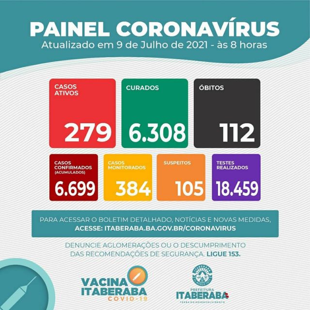 Atualmente Itaberaba tem 279 casos ativos, 105 casos suspeitos, 384 casos monitorados e 112 óbitos registrados pela doença. O número de casos curados é de 6.308 e, ao todo, já foram confirmados 6.699 casos da COVID-19 no município. Além disso, já foram realizados o total de 18.459 exames, dentre Testes Rápidos e RT-PCR/SWAB.