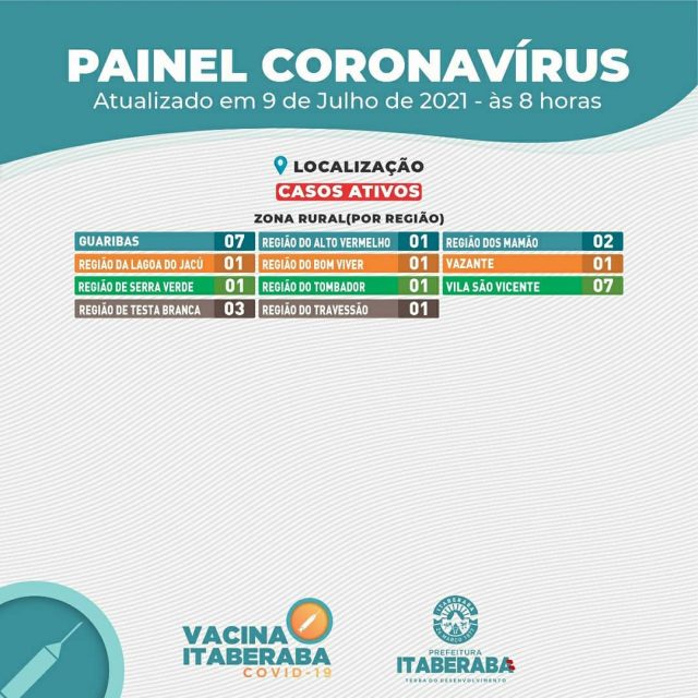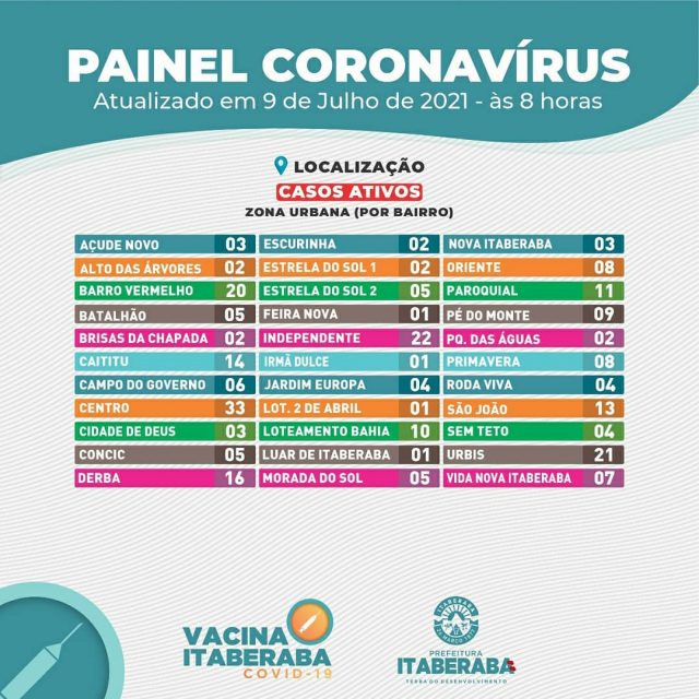 A Prefeitura de Itaberaba, por meio da Secretaria Municipal da Saúde, informa o boletim diário de sexta-feira (9) com dados consolidados até as 17h de quinta-feira (08)