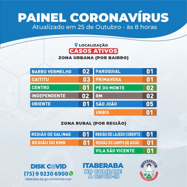 A Prefeitura de Itaberaba, por meio da Secretaria Municipal de Saúde (Sesau), assim como da Coordenação de Vigilância em Saúde e da Câmara Técnica (CT) de enfrentamento da pandemia do novo coronavírus, informa o Boletim Oficial 25/10 ㅡ com dados consolidados até às 17h de sábado (24) ㅡ que registrou 5 novos casos da COVID-19.