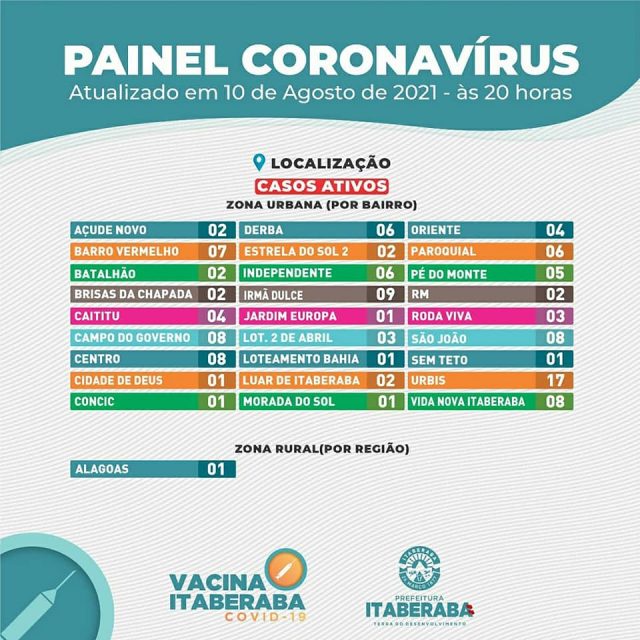 A Prefeitura de Itaberaba, por meio da Secretaria Municipal da Saúde, informa o boletim diário de terça-feira (10) com dados consolidados até as 17h.