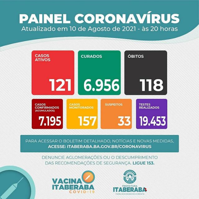 Atualmente Itaberaba tem 121 casos ativos, 33 casos suspeitos, 157 casos monitorados e 118 óbitos registrados pela doença. O número de casos curados é de 6.956 e, ao todo, já foram confirmados 7.195 casos da COVID-19 no município. Além disso, já foram realizados o total de 19.453 exames, dentre Testes Rápidos e RT-PCR/SWAB.