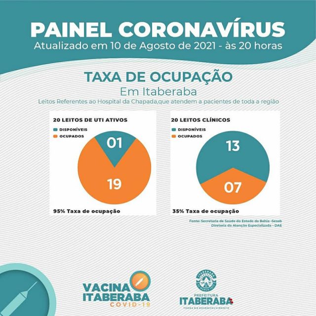 De acordo com o boletim diário de terça-feira (10) e do Estado da Bahia – SESAB, atualmente os números da taxa de ocupação de leitos no município são: 20 Leitos Clínicos, com 7 leitos ocupados, representando 35% de taxa de ocupação; 20 Leitos de Unidades de Terapia Intensiva – UTI, com 19 leitos ocupados, representando 95% de taxa de ocupação.