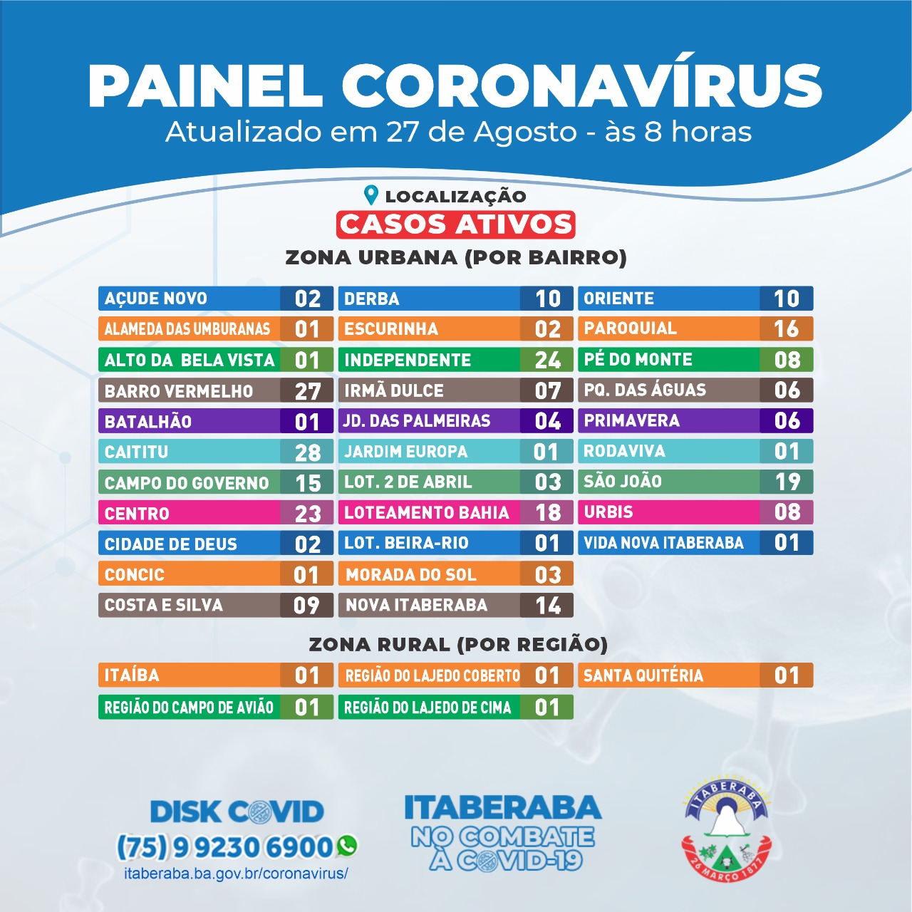 A Prefeitura de Itaberaba, por meio da Secretaria Municipal de Saúde (Sesau), assim como da Coordenação de Vigilância em Saúde e da Câmara Técnica (CT) de enfrentamento da pandemia do novo coronavírus, informa o Boletim Oficial 27/08 ㅡ com dados consolidados até às 17h de quarta-feira (26) ㅡ que registrou 16 novos casos da COVID-19.