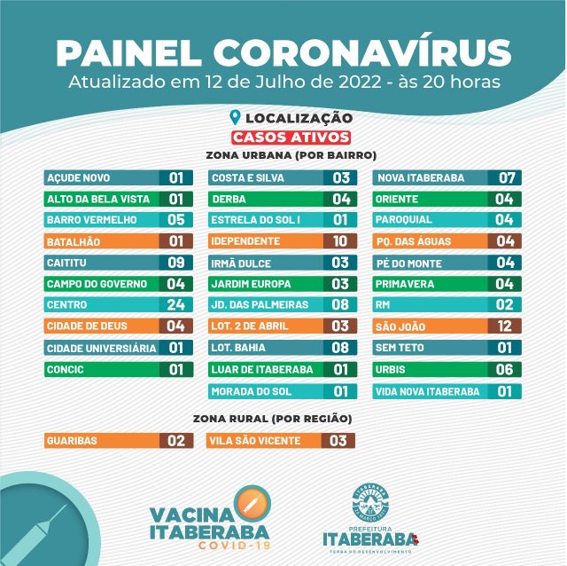 A Prefeitura de Itaberaba, por meio da Secretaria Municipal da Saúde, informa o boletim diário de terça-feira (12) com dados consolidados até as 17h de segunda-feira (11).