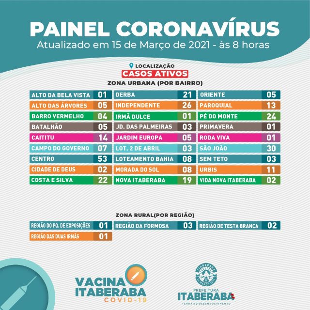 A Prefeitura de Itaberaba, por meio da Secretaria Municipal da Saúde, informa o boletim diário de segunda-feira (15) com dados consolidados até as 17h de domingo (14).