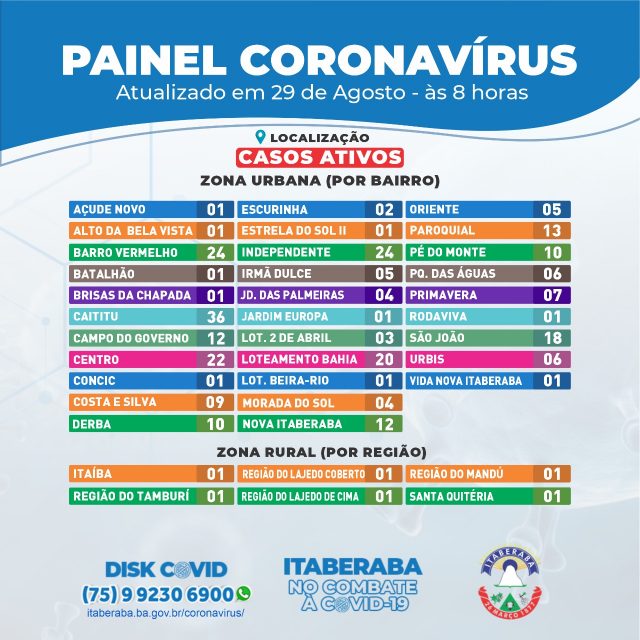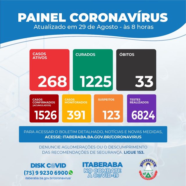 A Prefeitura de Itaberaba, por meio da Secretaria Municipal de Saúde (Sesau), assim como da Coordenação de Vigilância em Saúde e da Câmara Técnica (CT) de enfrentamento da pandemia do novo coronavírus, informa o Boletim Oficial 29/08 ㅡ com dados consolidados até às 17h de sexta-feira (28) ㅡ que registrou 15 novos casos da COVID-19.