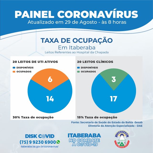 De acordo com o Boletim Oficial 29/08, até às 17h de sexta-feira (28), os números da Taxa de Ocupação Leitos Clínicos e de Unidades de Terapia Intensiva (UTI) no município, com dados da Secretaria da Saúde do Estado da Bahia (Sesab), são os seguintes: dos 20 LEITOS DE UTI ATIVOS, 6 estão ocupados (30%); ao passo que, dos 20 LEITOS CLÍNICOS, 3 estão ocupados atualmente (15%). A taxa de ocupação geral é de 22,50%.