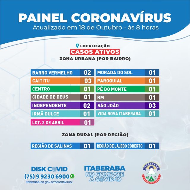 A Prefeitura de Itaberaba, por meio da Secretaria Municipal de Saúde (Sesau), assim como da Coordenação de Vigilância em Saúde e da Câmara Técnica (CT) de enfrentamento da pandemia do novo coronavírus, informa o Boletim Oficial 18/10 ㅡ com dados consolidados até às 17h de sábado (17) ㅡ que registrou 1 novos casos da COVID-19.