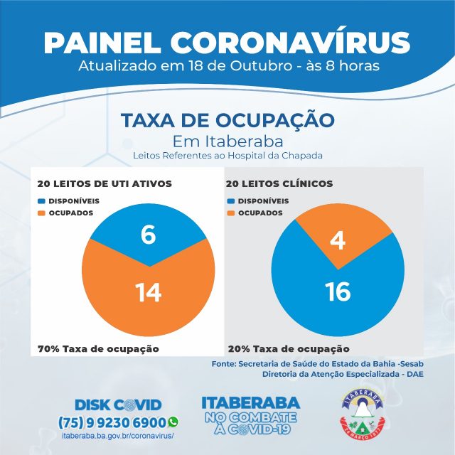 De acordo com o Boletim Oficial 18/10, até às 17h de sábado (17), os números da Taxa de Ocupação de Leitos Clínicos e de Unidades de Terapia Intensiva (UTIs) no município, com dados da Secretaria da Saúde do Estado da Bahia (Sesab), são os seguintes: dos 20 LEITOS DE UTI ATIVOS, 14 estão ocupados; ao passo que, dos 20 LEITOS CLÍNICOS, 4 estão ocupados atualmente.