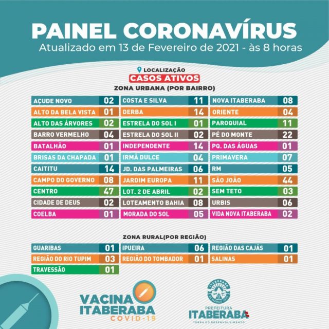 A Prefeitura de Itaberaba, por meio da Secretaria Municipal da Saúde, informa o boletim diário de sábado (13), com dados consolidados até as 17h de sexta-feira (12).