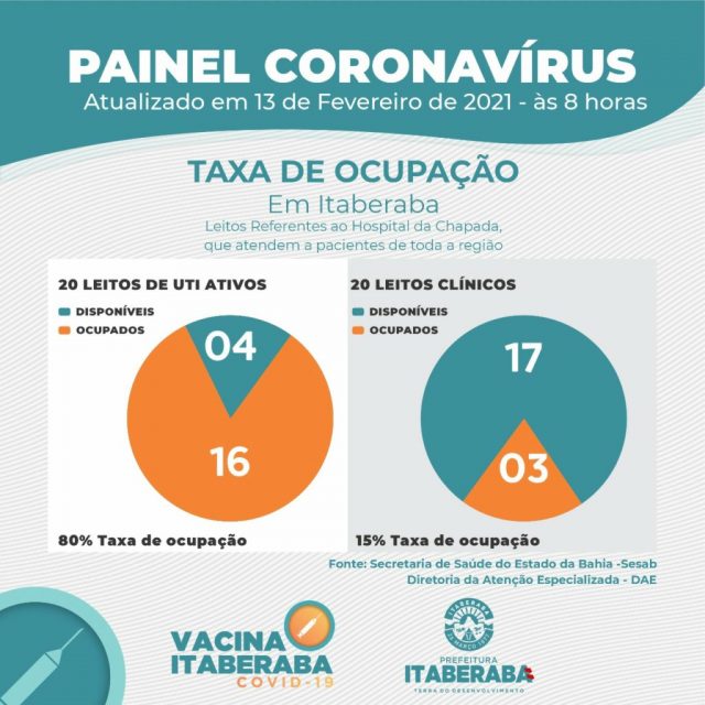 De acordo com o boletim diário de sábado (13), com dados consolidados até as 17h de sexta-feira (12), e de acordo com a as informações da Secretaria da Saúde do Estado da Bahia – SESAB, atualmente os números da taxa de ocupação de leitos no município são: 20 Leitos Clínicos, com 3 leitos ocupados, representando 15% de taxa de ocupação; 20 Leitos de Unidades de Terapia Intensiva – UTI, com 16 leitos ocupados, representando 80% de taxa de ocupação.