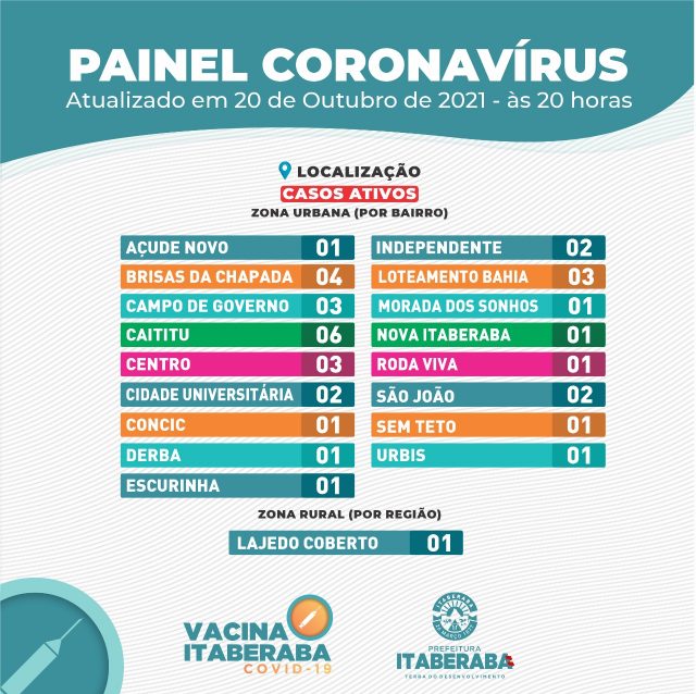 A Prefeitura de Itaberaba, por meio da Secretaria Municipal da Saúde, informa o boletim diário de quarta-feira (20) com dados consolidados até as 17h.