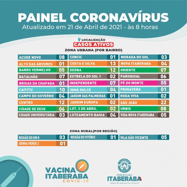 A Prefeitura de Itaberaba, por meio da Secretaria Municipal da Saúde, informa o boletim diário de quarta-feira (21) com dados consolidados até as 17h de terça-feira (20).