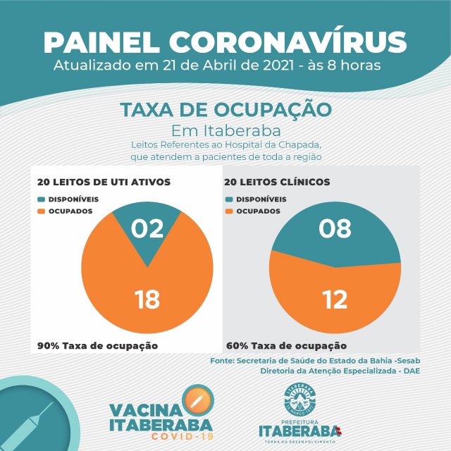 De acordo com o boletim diário de quarta-feira (21), com dados consolidados até as 17h de terça-feira (20), e de acordo com a as informações da Secretaria da Saúde do Estado da Bahia – SESAB, atualmente os números da taxa de ocupação de leitos no município são: 20 Leitos Clínicos, com 12 leitos ocupados, representando 60% de taxa de ocupação; 20 Leitos de Unidades de Terapia Intensiva – UTI, com 18 leitos ocupados, representando 90% de taxa de ocupação.