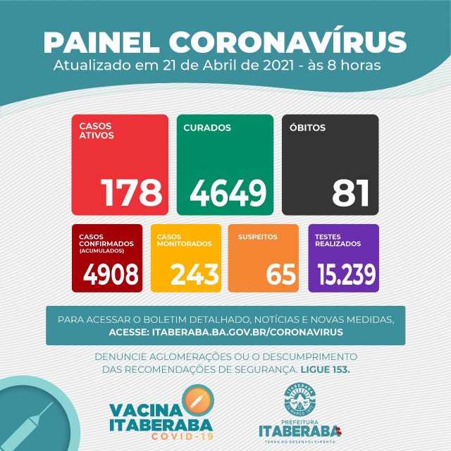 Atualmente Itaberaba tem 178 casos ativos, 65 casos suspeitos, 243 casos monitorados e 81 óbitos registrados pela doença. O número de casos curados é de 4.649 e, ao todo, já foram confirmados 4.908 casos da COVID-19 no município. Além disso, já foram realizados o total de 15.239 exames, dentre Testes Rápidos e RT-PCR/SWAB.