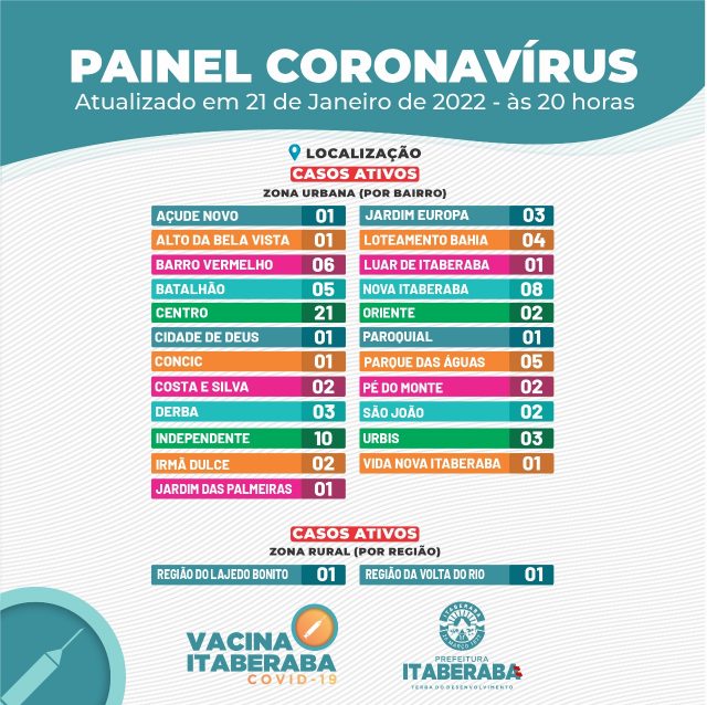 A Prefeitura de Itaberaba, por meio da Secretaria Municipal da Saúde, informa o boletim diário de sexta-feira (21) com dados consolidados até as 17h.