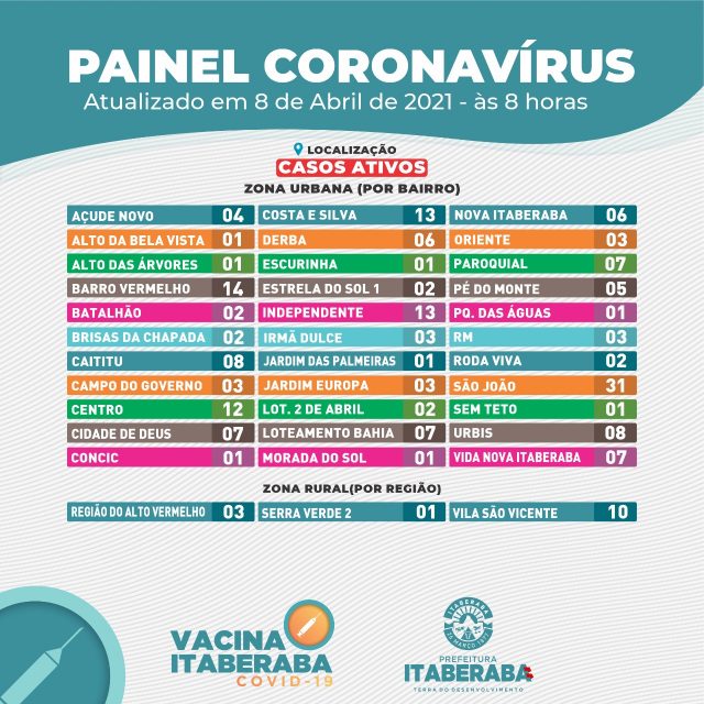 A Prefeitura de Itaberaba, por meio da Secretaria Municipal da Saúde, informa o boletim diário de quinta-feira (8) com dados consolidados até as 17h de quarta-feira (7).