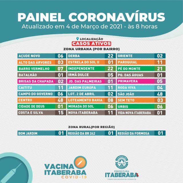 Em Itaberaba, 64 pessoas perderam a vida para a Covid-19. A informação foi divulgada na manhã desta quinta-feira (04) pela prefeitura, através da atualização do Painel Coronavírus.