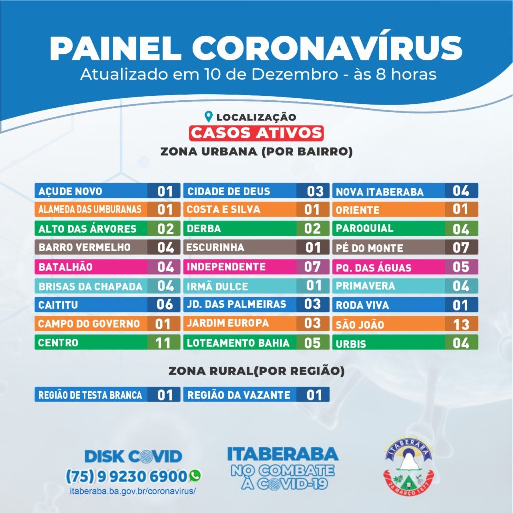 A Prefeitura de Itaberaba, por meio da Secretaria Municipal de Saúde (Sesau), assim como da Coordenação de Vigilância em Saúde e da Câmara Técnica (CT) de enfrentamento da pandemia do novo coronavírus, informa o Boletim Oficial 10/12 ㅡ com dados consolidados até às 17h de quarta-feira (09) ㅡ que registrou 19 novos casos da COVID-19.