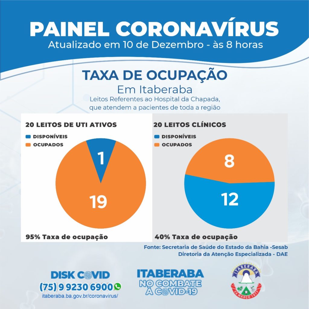 De acordo com o Boletim Oficial 10/12, até às 17h de quarta-feira (09), os números da Taxa de Ocupação de Leitos Clínicos e de Unidades de Terapia Intensiva (UTIs) no município, com dados da Secretaria da Saúde do Estado da Bahia (Sesab), são os seguintes: dos 20 LEITOS DE UTI ATIVOS, 19 estão ocupados; ao passo que, dos 20 LEITOS CLÍNICOS, 8 estão ocupados atualmente.