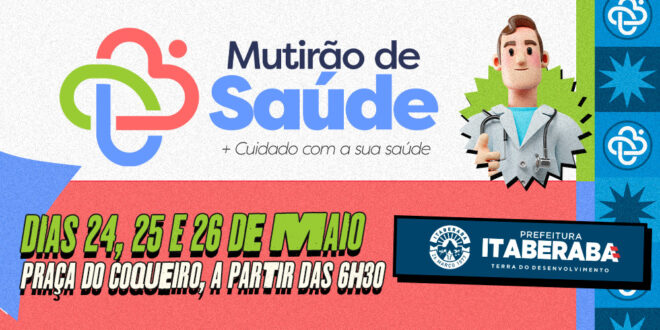 A Prefeitura de Itaberaba, através da Secretaria Municipal de Saúde, realiza nos dias 24, 25 e 26 de maio o mutirão de saúde “+ Cuidado com a sua saúde”, com mais de mil atendimentos por dia, entre consultas médicas, exames e vacinação. O mutirão será realizado na praça do Coqueiro, a partir das 6h30.