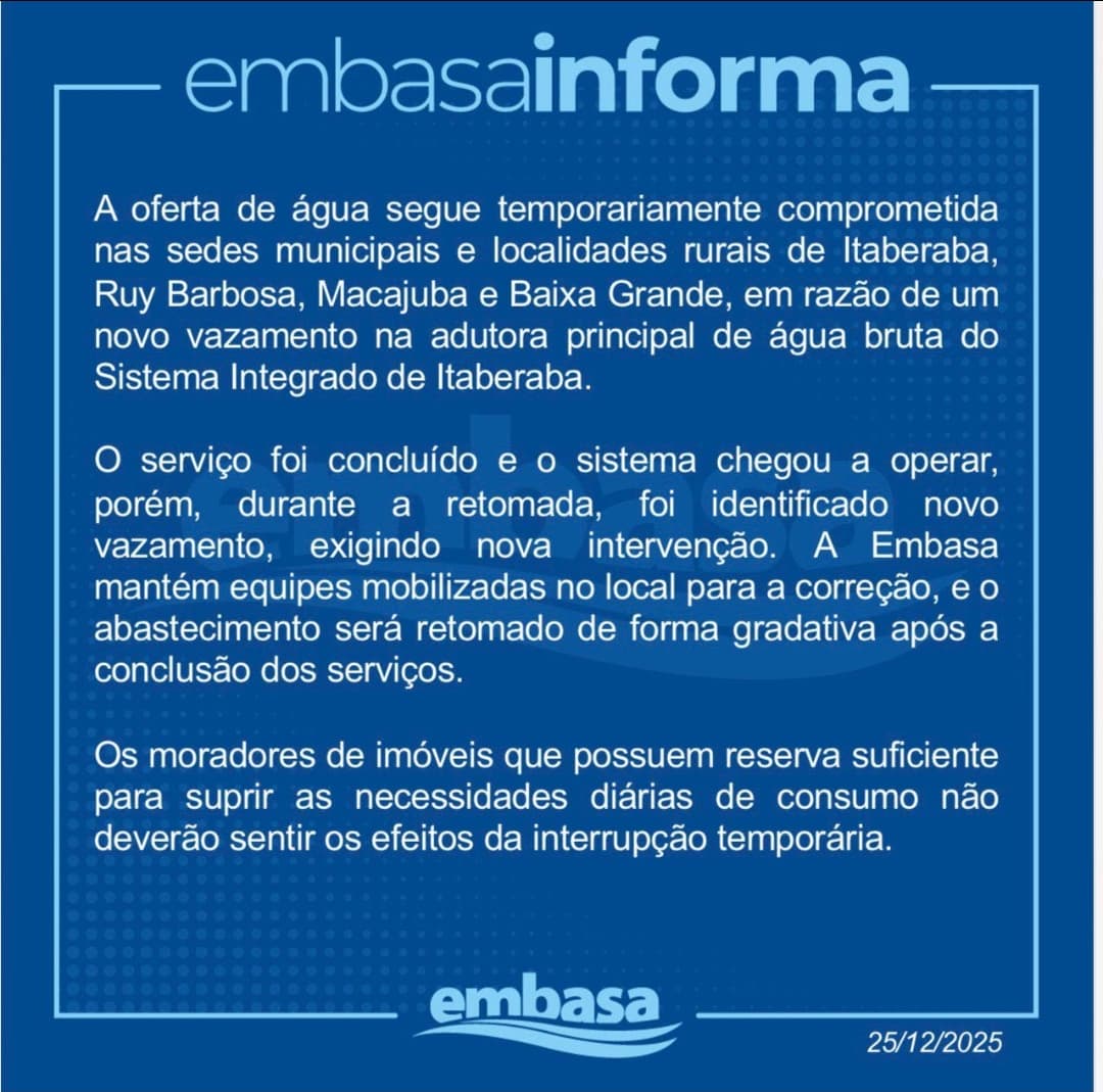 Em nota divulgada nesta quarta-feira (25), a Embasa informou que o fornecimento de água está temporariamente comprometido devido a um novo vazamento na adutora principal de água bruta do Sistema Integrado de Itaberaba.