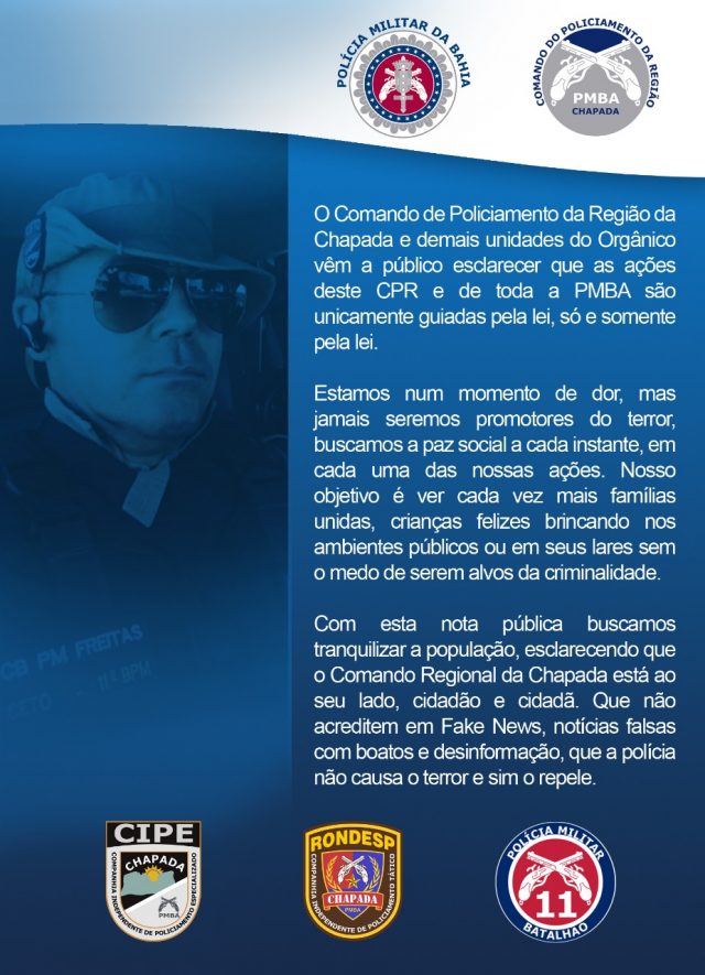Em resposta aos boatos, a Policia Militar divulgou um comunicado tranquilizando à população. No comunicado, o Comando de Policiamento da região da Chapada – CPR-Chapada, em nome de toda a PMBA, informou que as ações policiais são unicamente guiadas pela Lei e somente pela Lei. Com a nota a PM busca tranquilizar a população, pede que não acreditem em Fake News e reforça que a polícia não causa o terror.