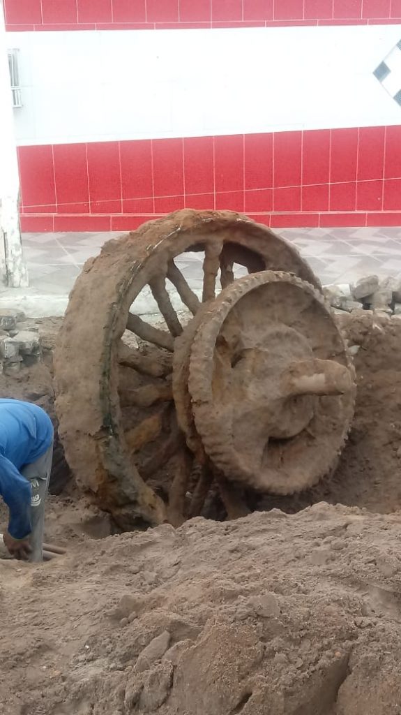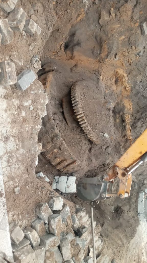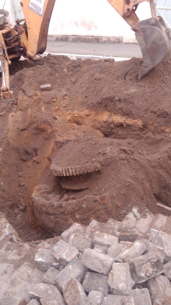 O artefato, que aparenta ser uma roda de um trator a vapor antigo ou uma parte de uma velha caldeira, foi encontrado durante a realização de uma obra de esgotamento sanitário no centro da cidade.