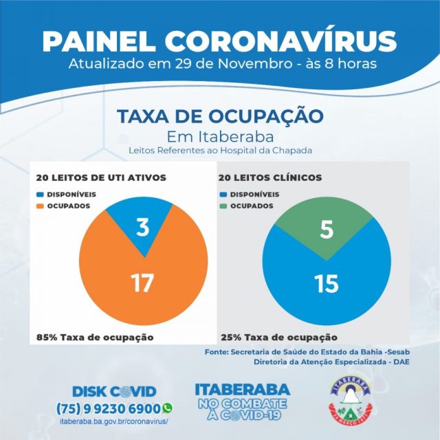De acordo com o Boletim Oficial 29/11, até às 17h de sábado (28), os números da Taxa de Ocupação de Leitos Clínicos e de Unidades de Terapia Intensiva (UTIs) no município, com dados da Secretaria da Saúde do Estado da Bahia (Sesab), são os seguintes: dos 20 LEITOS DE UTI ATIVOS, 17 estão ocupados; ao passo que, dos 20 LEITOS CLÍNICOS, 5 estão ocupados atualmente.