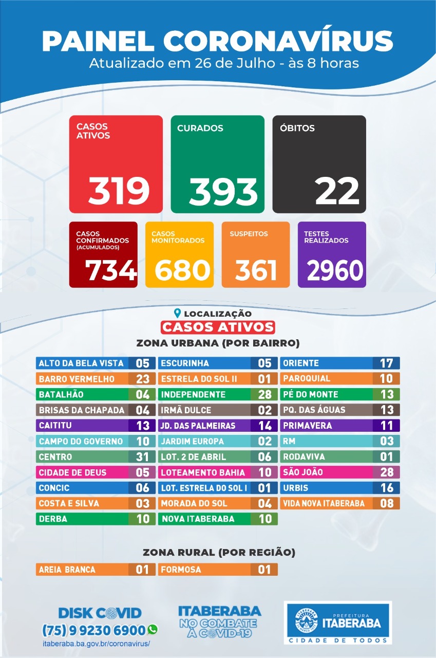 A Prefeitura de Itaberaba, por meio da Secretaria Municipal de Saúde (Sesau), assim como da Coordenação de Vigilância em Saúde e da Câmara Técnica (CT) de enfrentamento da pandemia do novo coronavírus, informa o Boletim Oficial 26/07 ㅡ com dados consolidados até as 17h de sábado (25) ㅡ que registrou 3 novos casos da COVID-19.