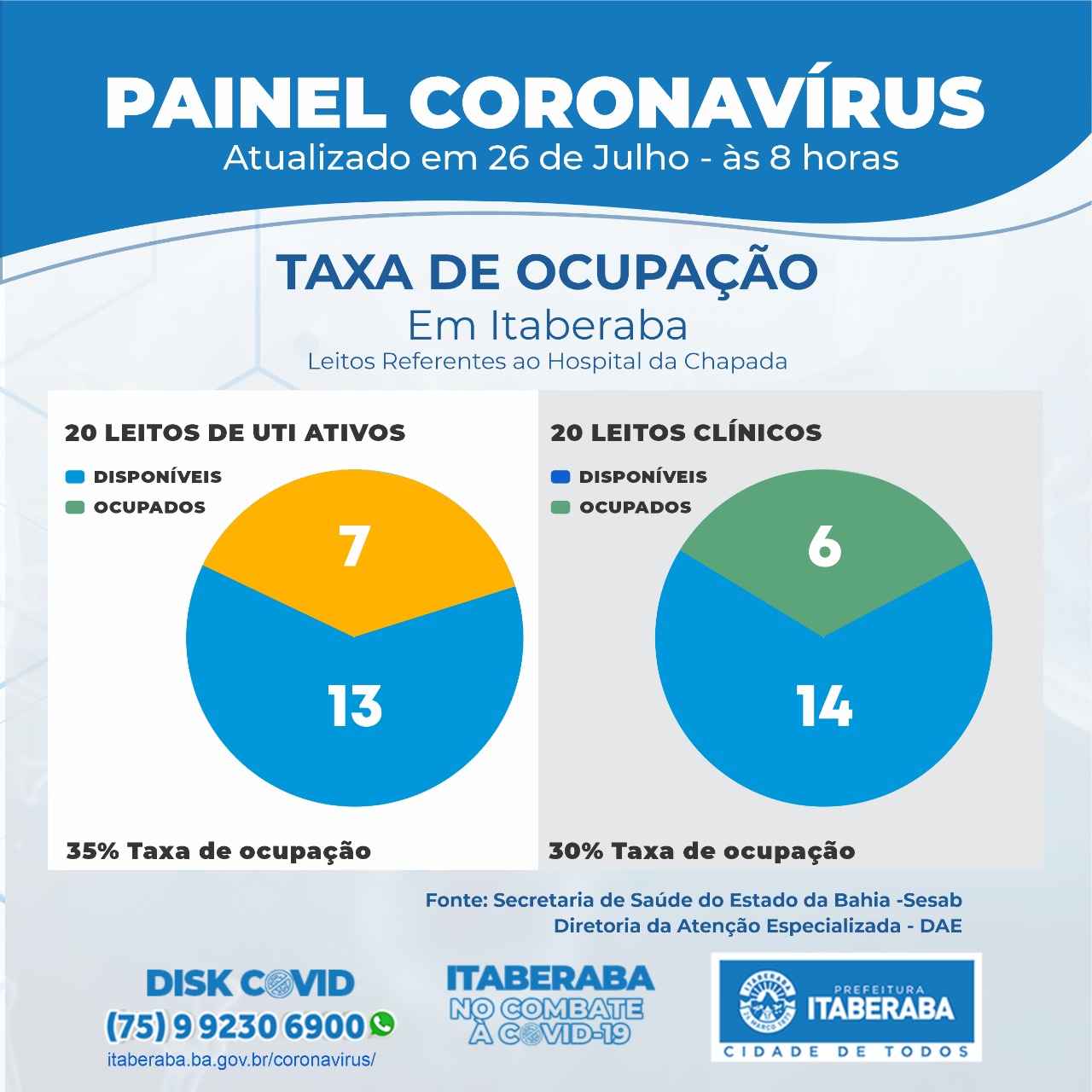 De acordo com o Boletim Oficial 26/07, até as 17h de sábado (25), os números da Taxa de Ocupação Leitos Clínicos e de Unidades de Terapia Intensiva (UTI) no município, com dados da Secretaria da Saúde do Estado da Bahia (Sesab), são os seguintes: dos 20 LEITOS DE UTI ATIVOS, 7 estão ocupados (35%); ao passo que, dos 20 LEITOS CLÍNICOS, 6 estão ocupados atualmente (30%). A taxa de ocupação geral é de 32,5%.