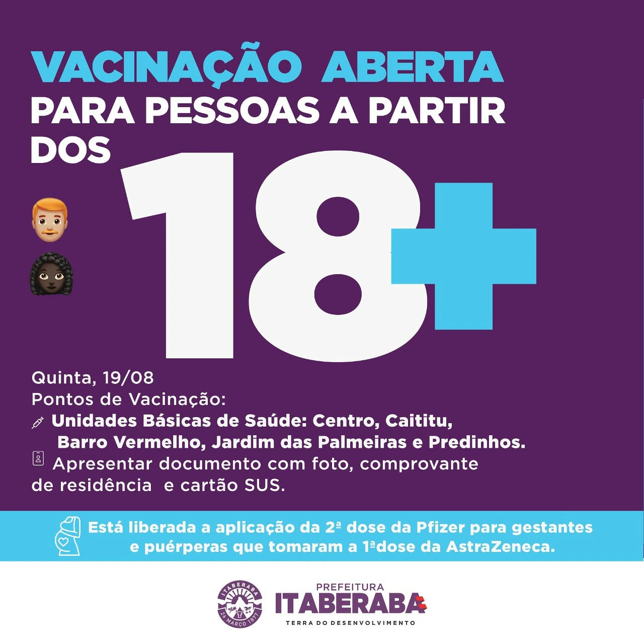 A prefeitura de Itaberaba ampliou o Cronograma Municipal de Imunização para pessoas de 18 anos.