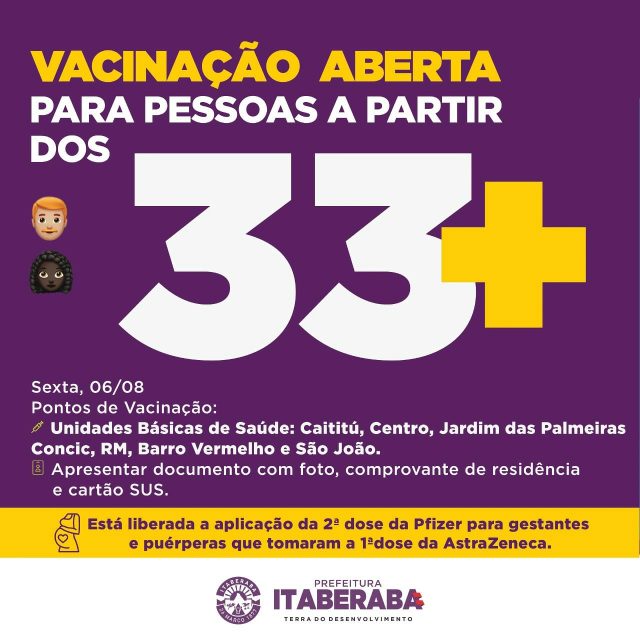 Com o recebimento dessa nova remessa, a Prefeitura dará seguimento a vacinação e vai possibilitar ampliar a faixa etária para as pessoas com 33 anos ou mais de idade. A estratégia de vacinação da primeira dose para gestantes e puérperas, acima de 18 anos, segue normalmente, em todo o município.