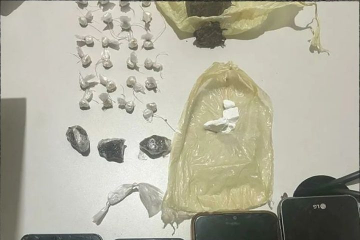 Ao ser abordado, foram encontrados com o mesmo, 24 trouxinhas de substância análoga a crack, 04 smartphones, 01 porção de pasta base análoga a cocaína, 01 porção de substância análoga a cocaína, 01 porção grande de substância análoga a maconha e 03 porções de substância análoga a maconha.
